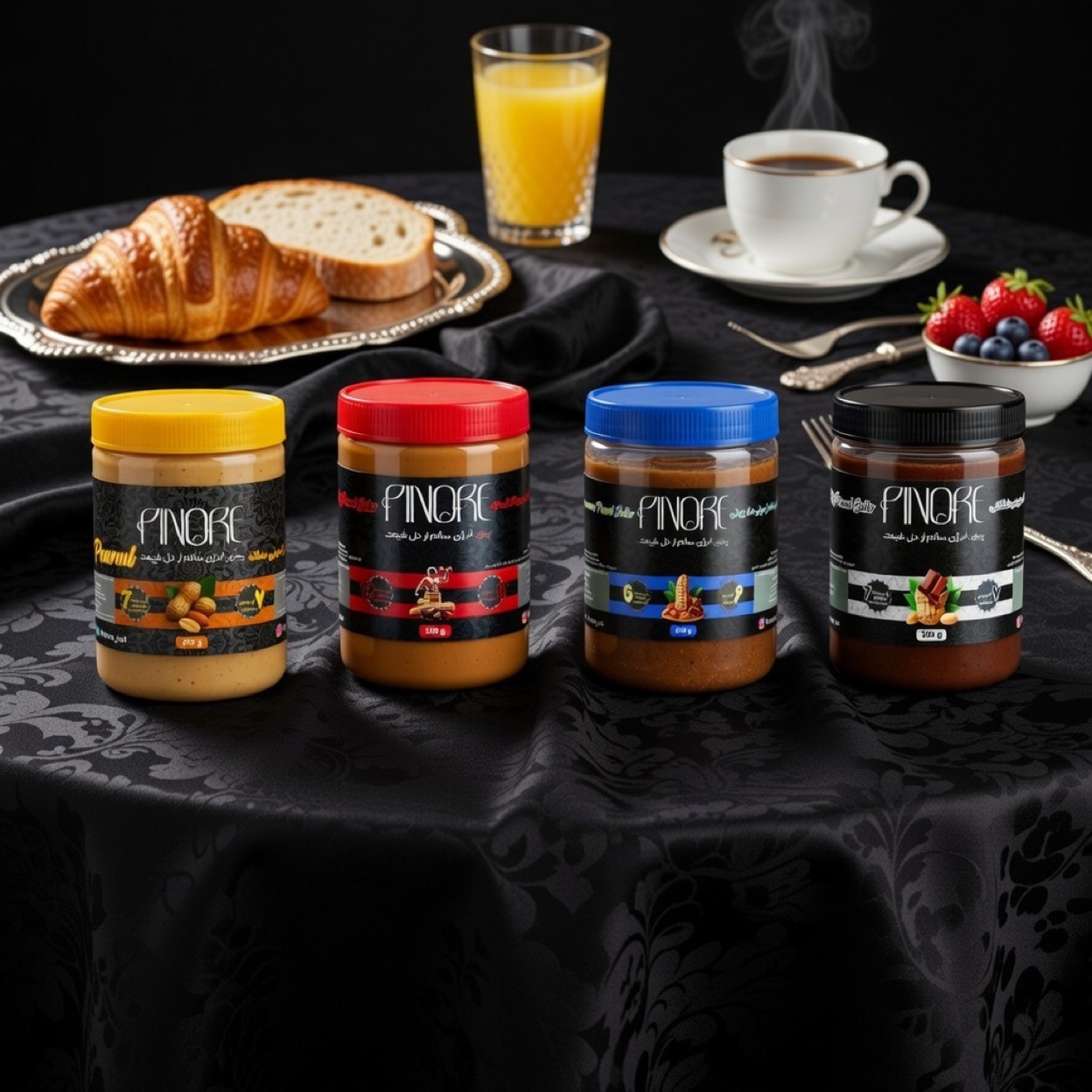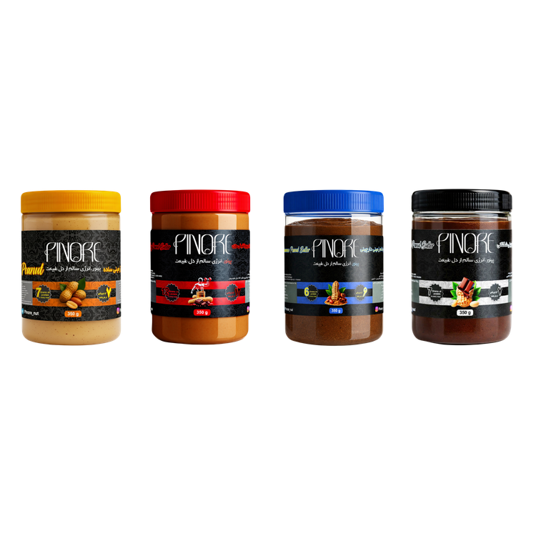 محتوای پک: کره بادام زمینی ساده - کره بادام زمینی شکلاتی - کره بادام زمینی پروتئینی - کره بادام زمینی دارچین شکلاتی